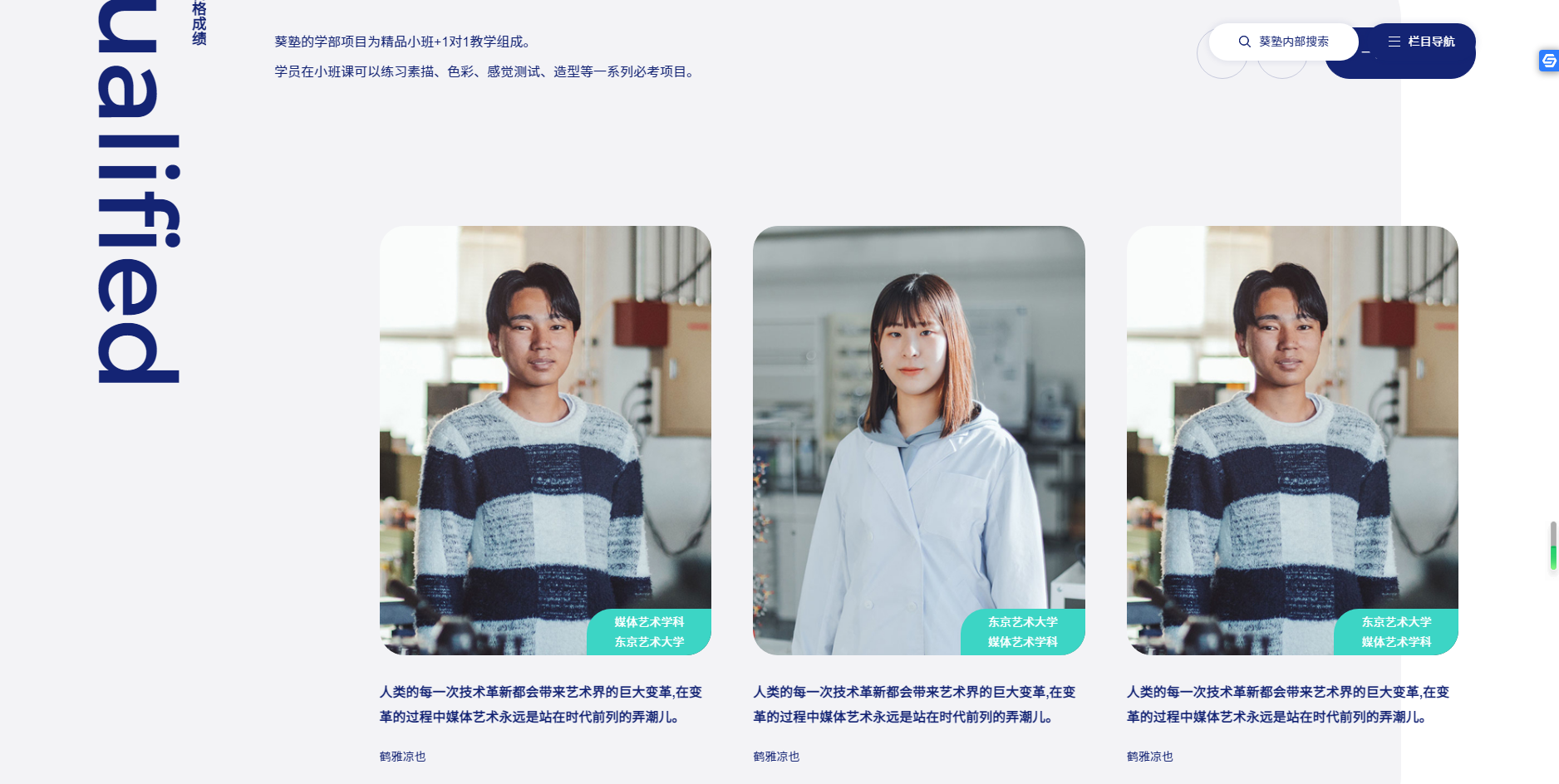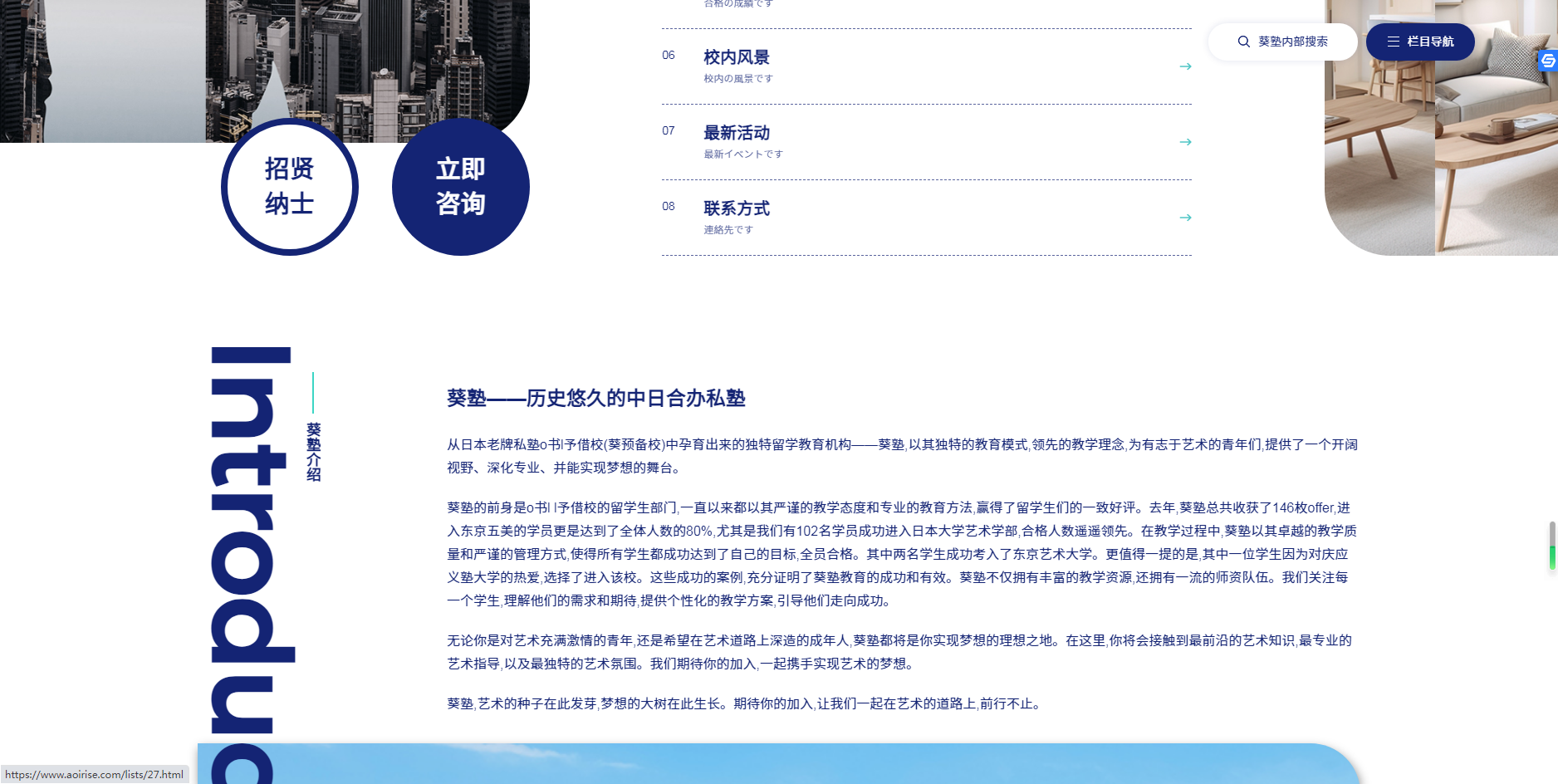 日本葵塾從日本老牌私塾o書l予借校(葵預備校)中孕育出來的獨特留學教育機構 葵塾,主要專攻設計建筑、視覺藝術、文化藝術、表演藝術四大學科;以其獨特的教育模式,領先的教學理念,為有志于藝術的青年們,提供了一個開闊視野、深化專業、并能實現夢想的舞臺